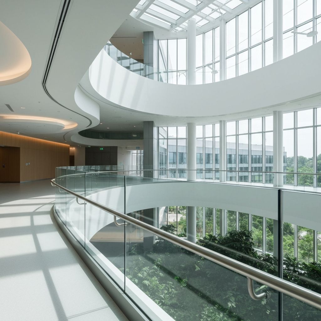 Multi-story library with open atrium featuring glass and aluminum railing systems.